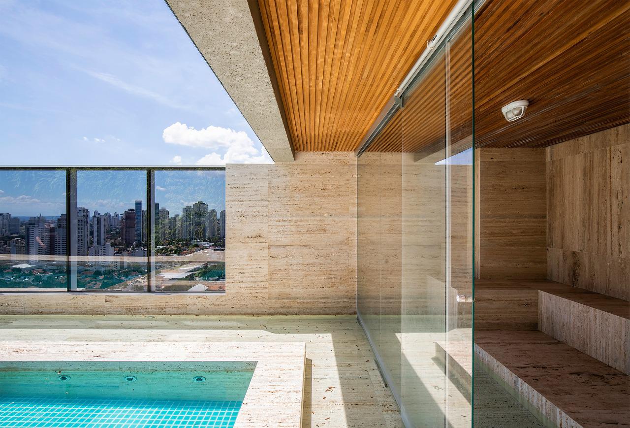 Sauna privativa, spa e piscina aquecida, integrados à área de lazer