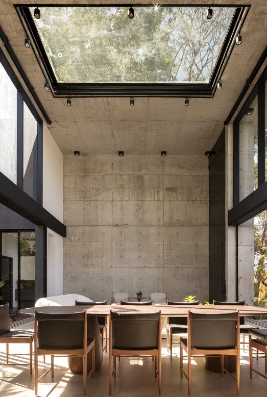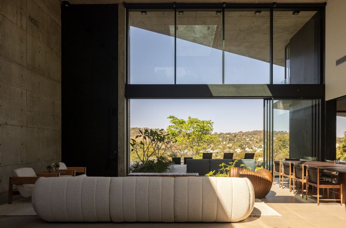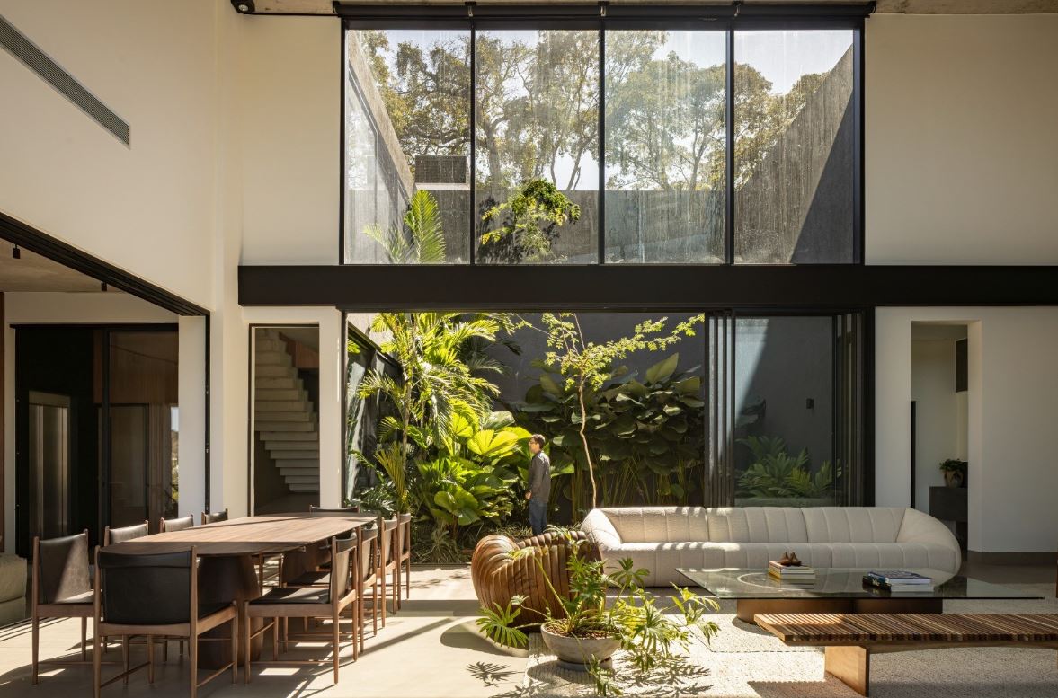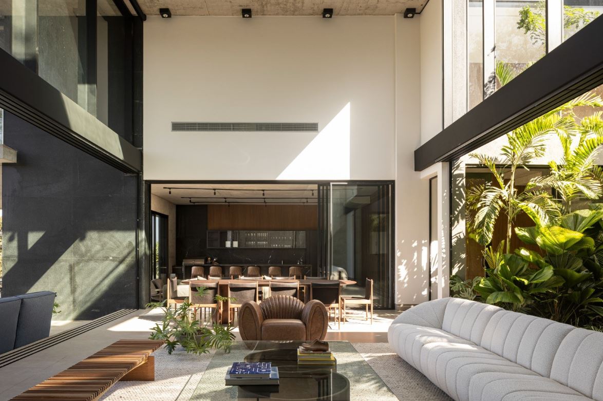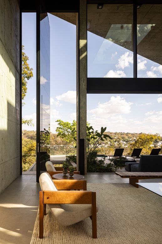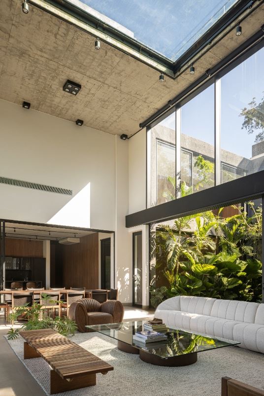 - Sala de estar com 63,65 m², pé-direito duplo e visor em vidro estrutural, valorizando iluminação natural e imponência arquitetônica