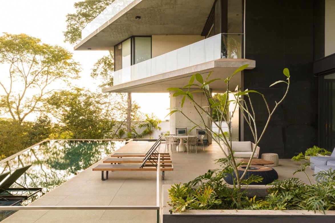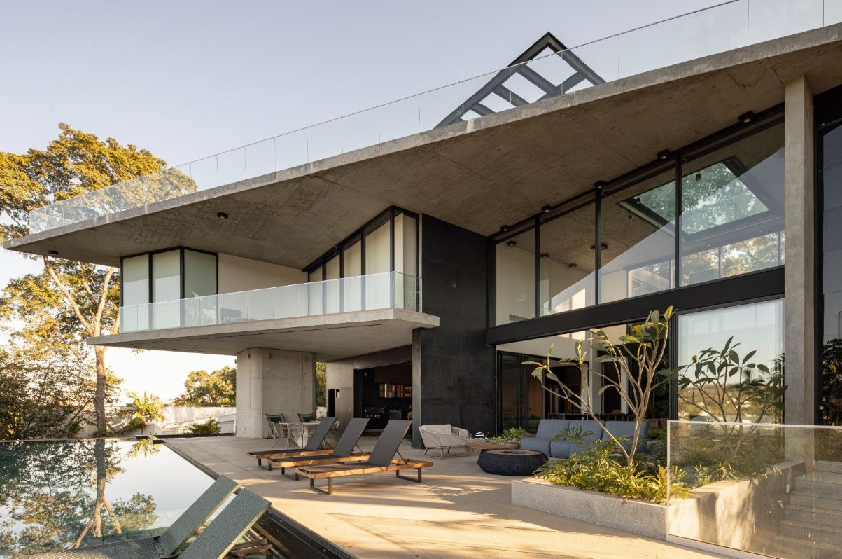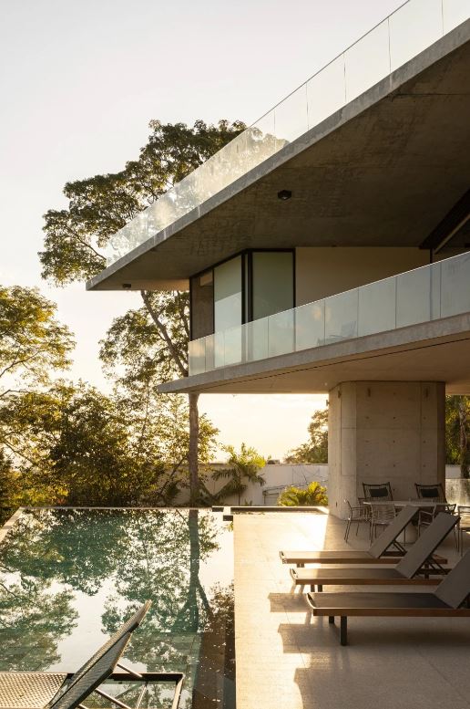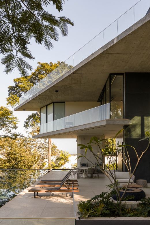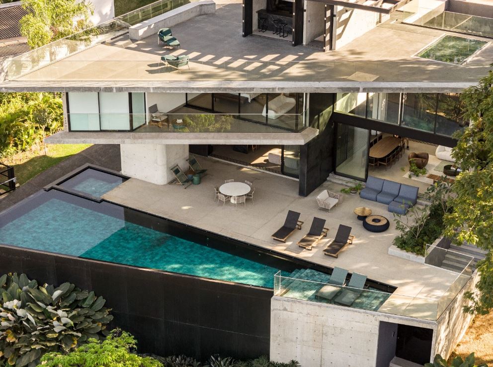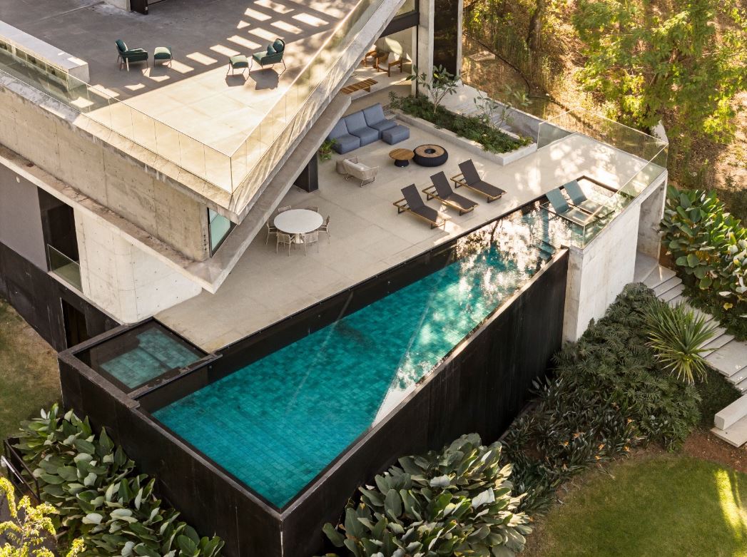 - Piscina com borda infinita, implantada em pátio elevado com 126,87 m², criando um cenário de lazer sofisticado e contemplativo