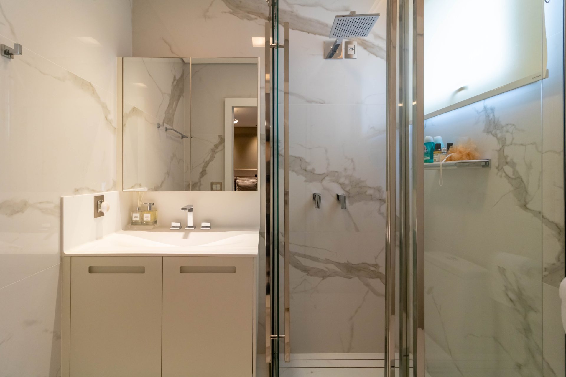 • Banheiros exclusivos com acabamento Corian e metais Deca