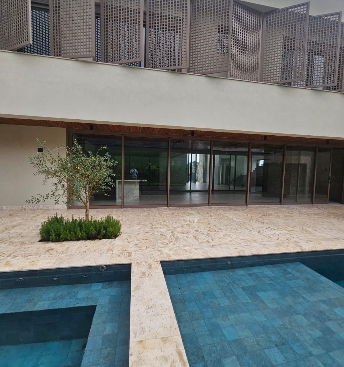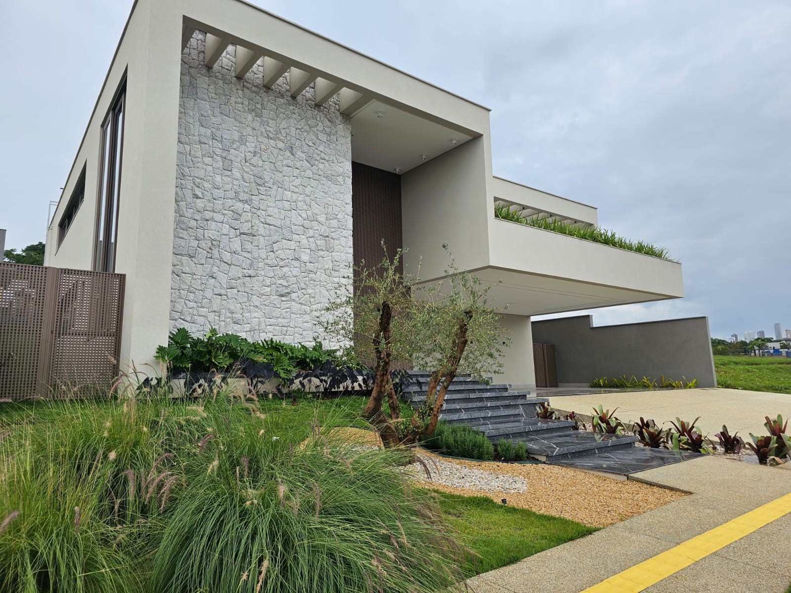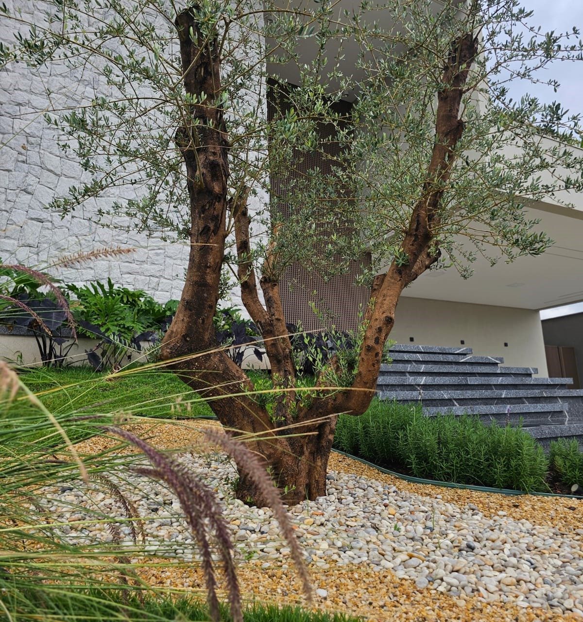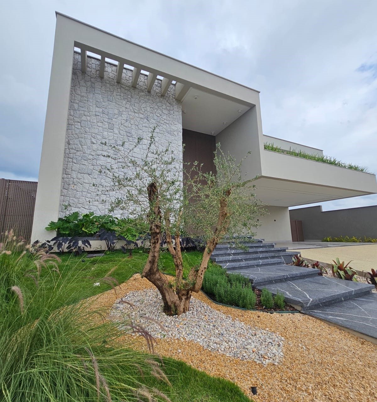 A fachada contemporânea impressiona desde a chegada, com o uso de pedras naturais, paisagismo autoral e uma oliveira imponente na entrada, símbolo de longevidade, força e exclusividade. Diferente de construções convencionais, a casa não se limita aos muros: ela respira, se integra ao entorno e valoriza cada elemento natural ao seu redor.