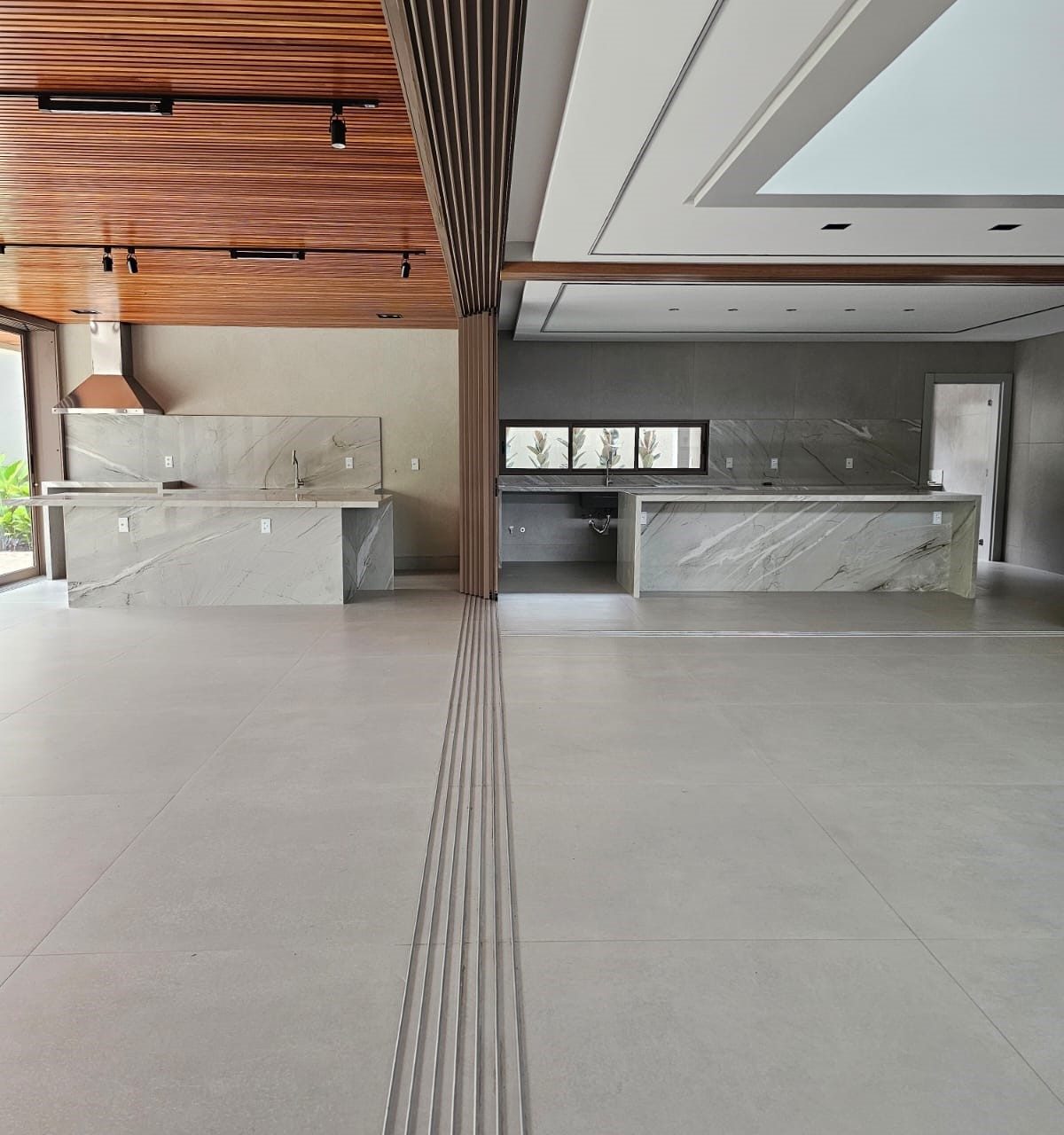 A entrada social é marcada por uma porta monumental, que conduz a um hall sofisticado revestido em mármore preto rajado, criando impacto visual imediato. O pé-direito elevado potencializa a iluminação natural e valoriza o projeto luminotécnico em LED, reforçando a imponência do imóvel.