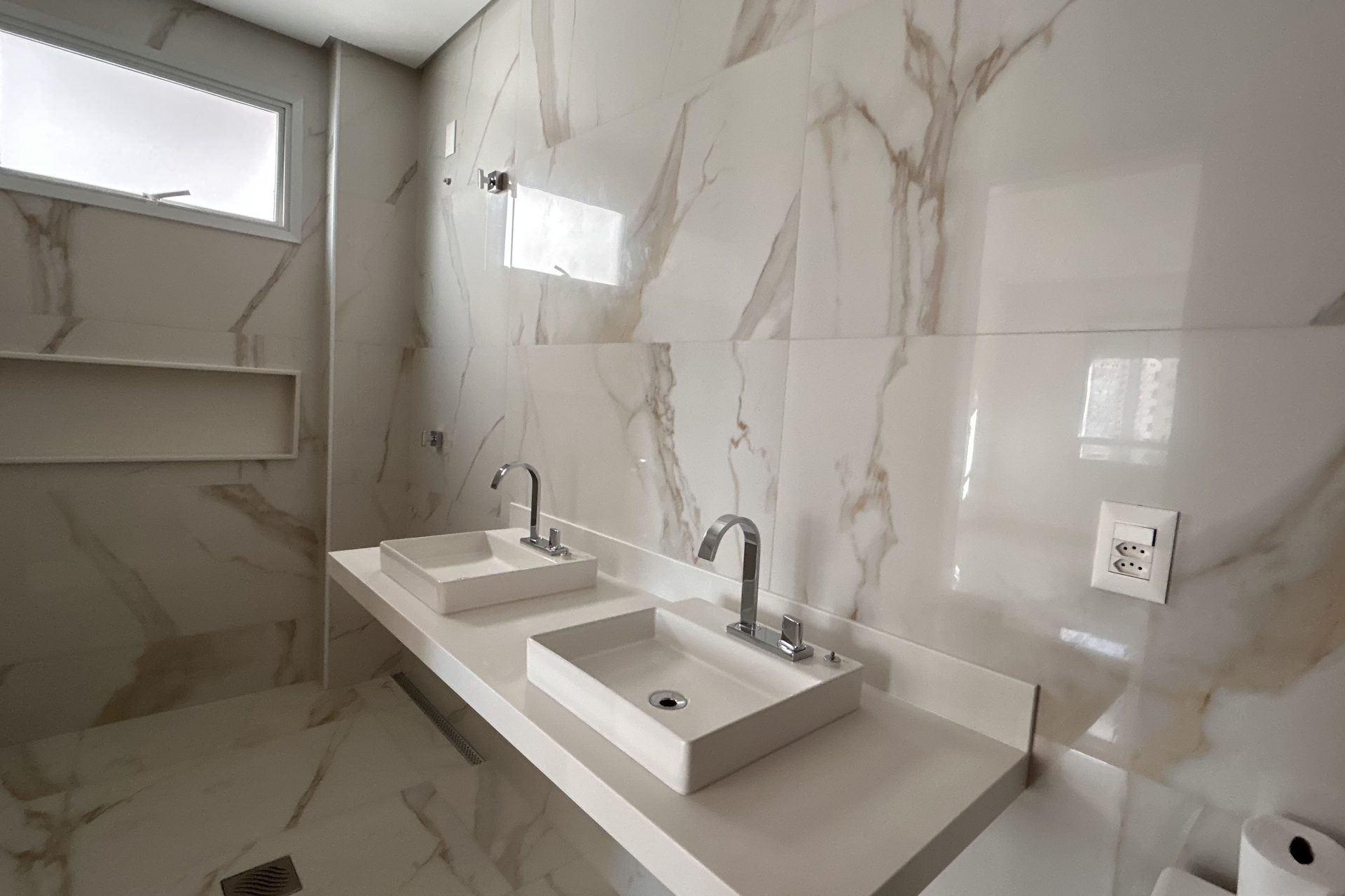 Porcelanato 90×90, que reforça a sensação de amplitude e requinte;