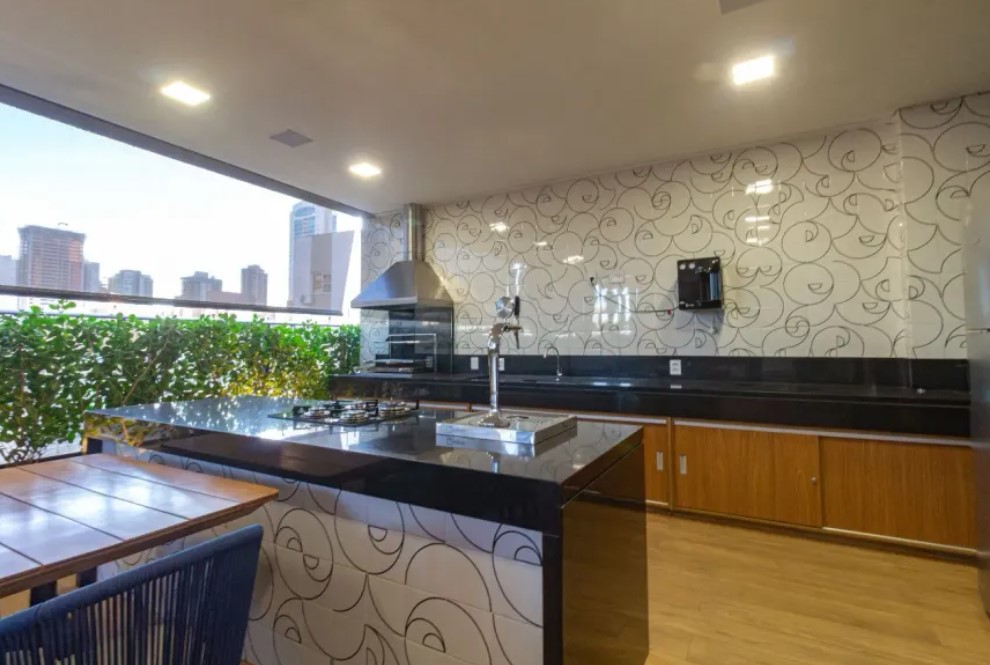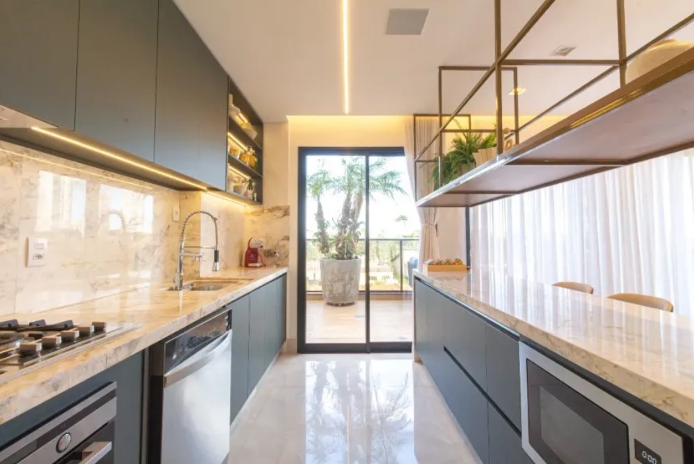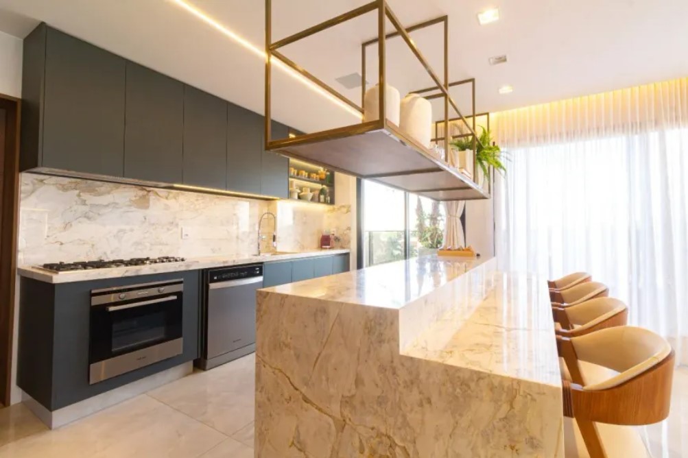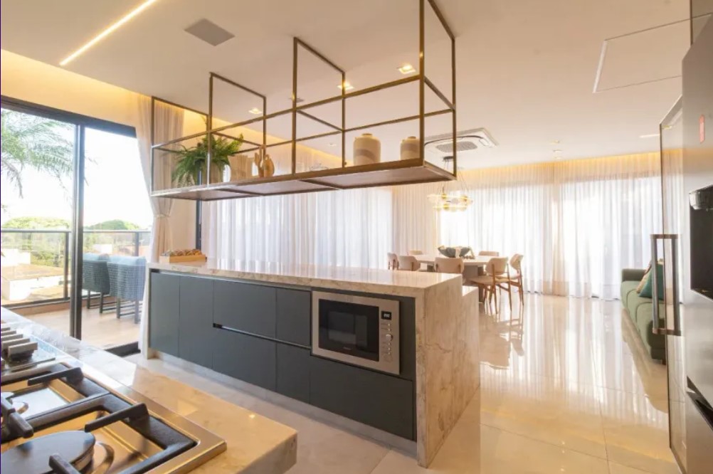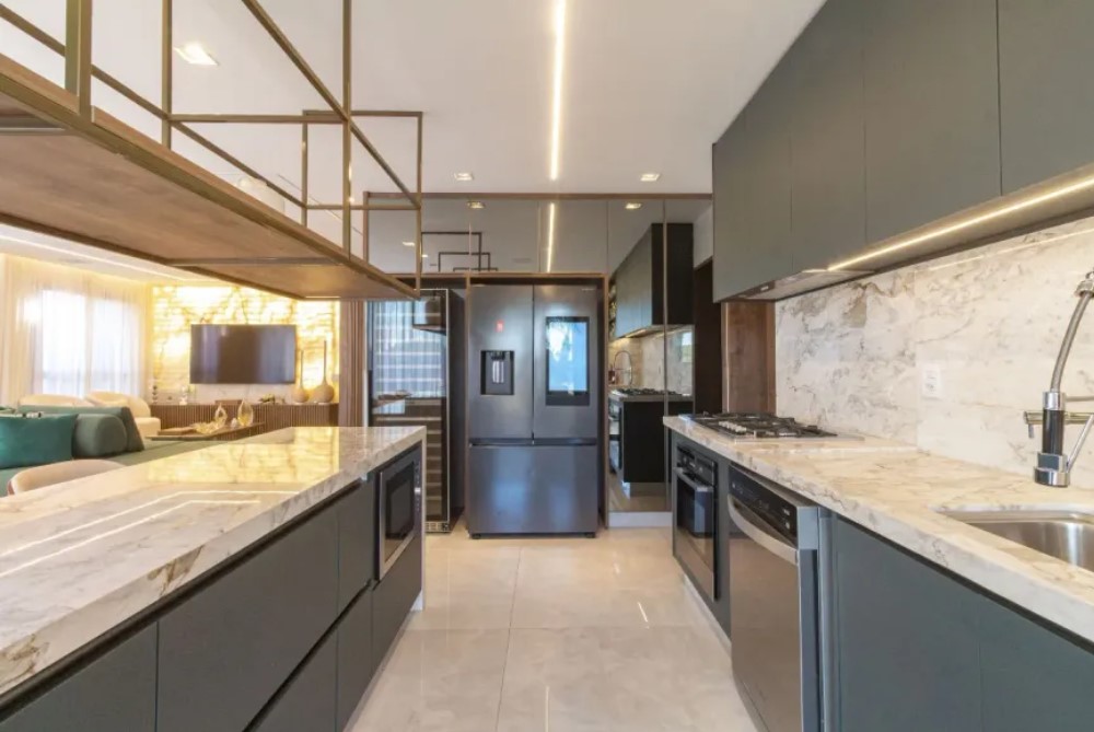 A cozinha gourmet é um convite à convivência, equipada com eletrodomésticos premium: