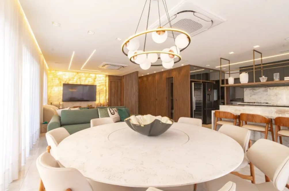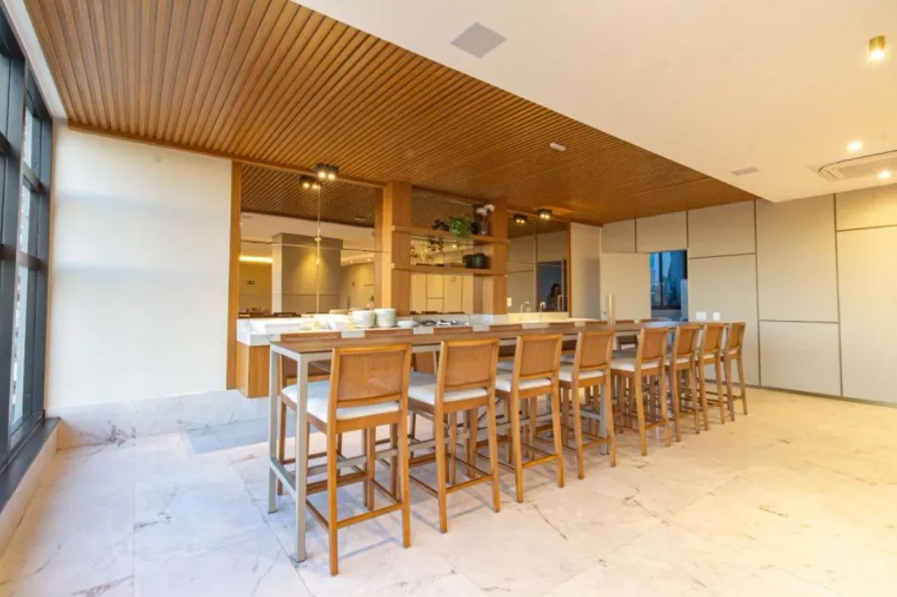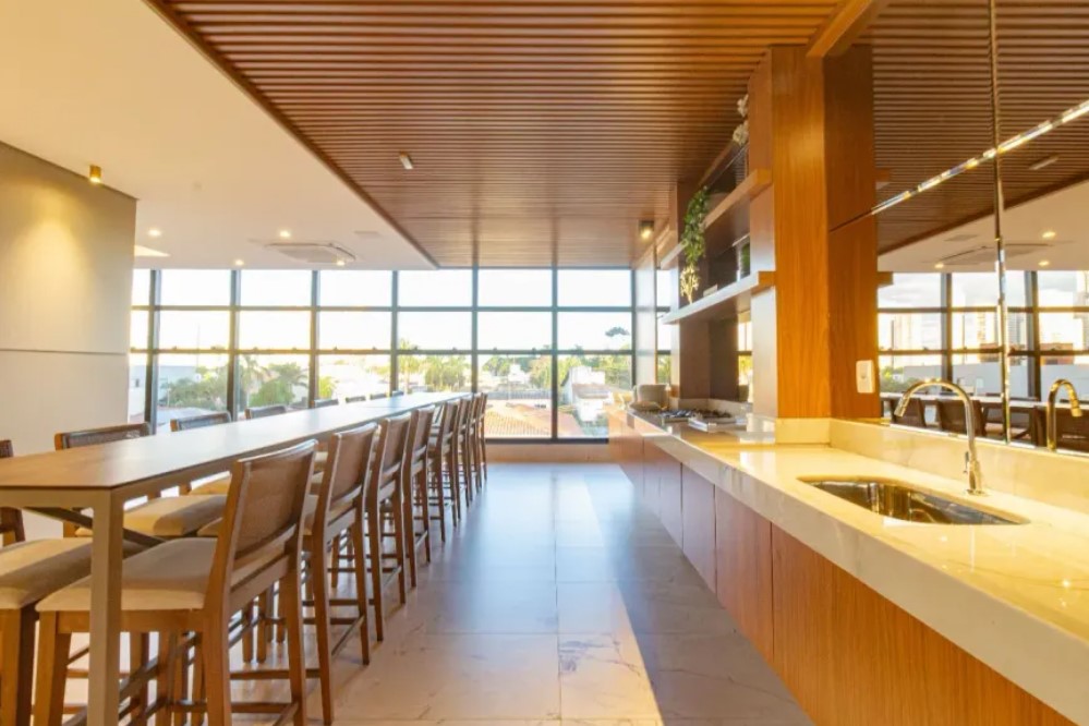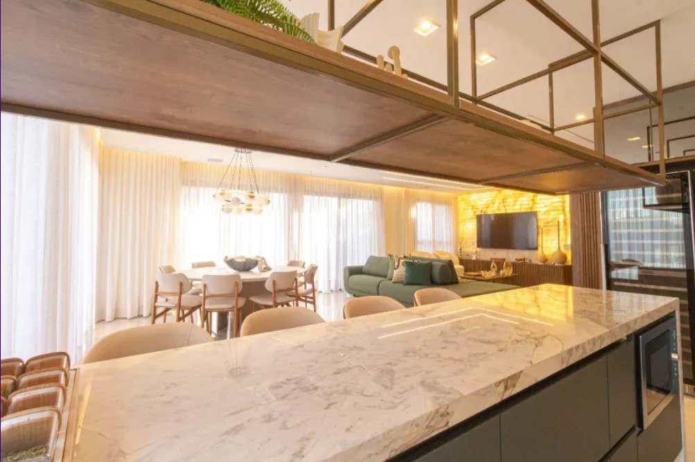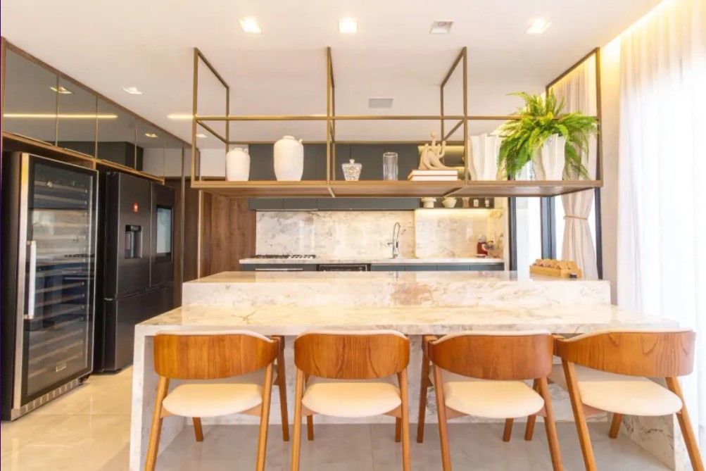 A cozinha gourmet é um convite à convivência, equipada com eletrodomésticos premium: