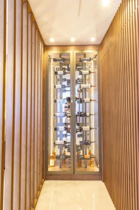 Área gourmet com churrasqueira elétrica Versia, cooktop De Bacco, adega, cervejeira, bancada em pedra Ônix e mobiliário em corda náutica.
